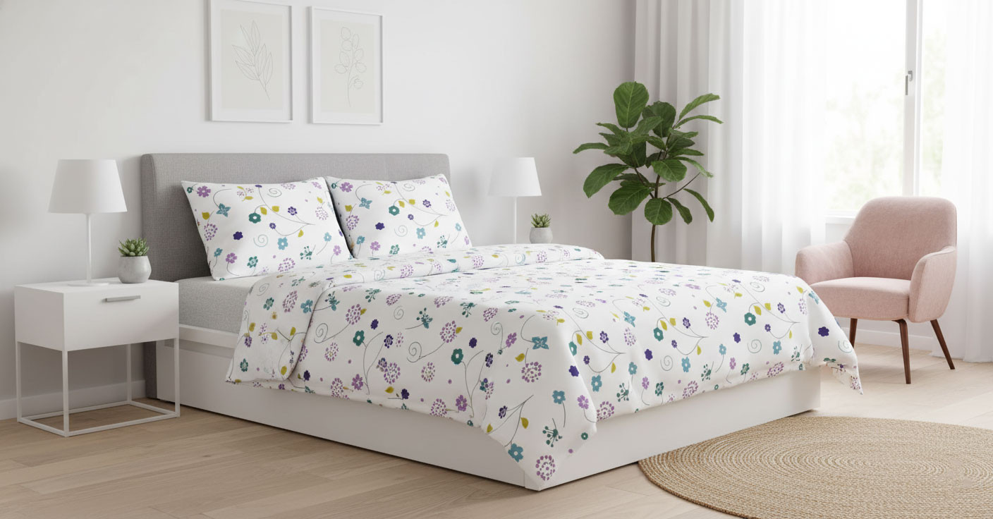 Bettgarnitur Duvet Satin Blau mit kleine bunte Blume