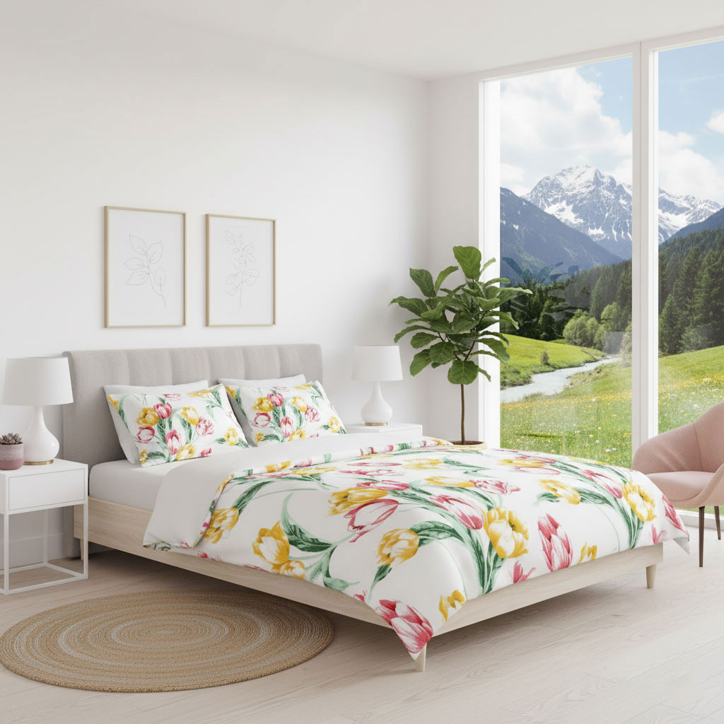 Bettgarnitur Duvet Satin Blau mit rote und gelbe Tulpenblüte - Der Test wird nicht real sein